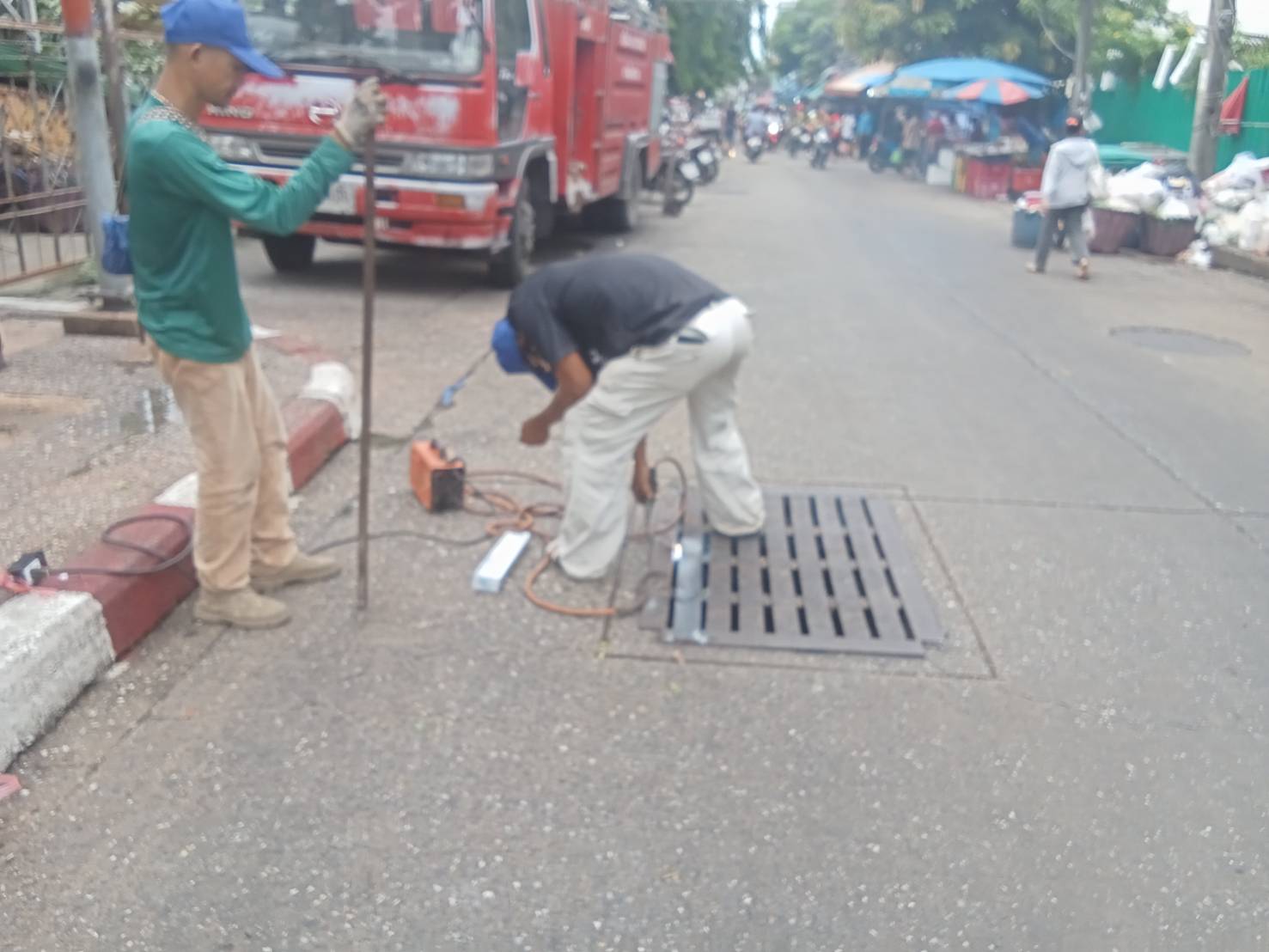 เจ้าหน้าที่กองช่างซ่อมแซมฝาท่อระบายน้ำ |